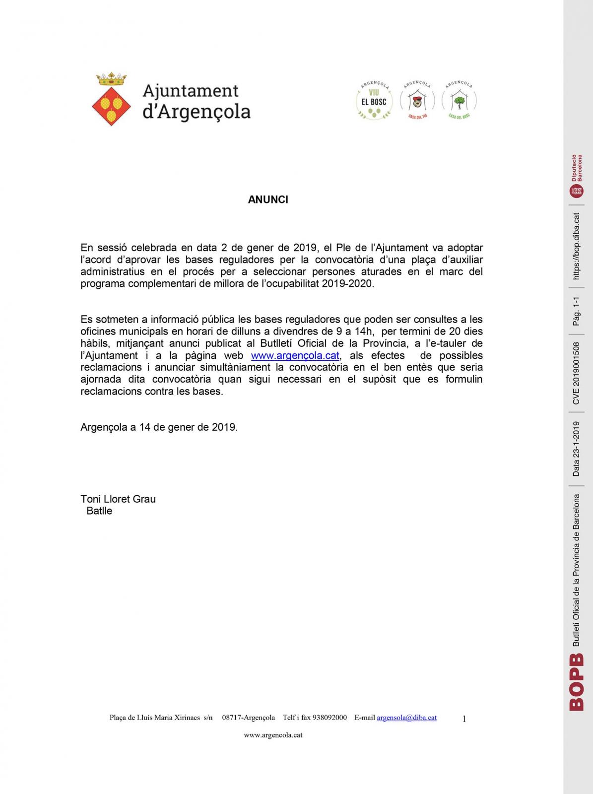 En sessió celebrada en data 2 de gener de 2019, el Ple de l’Ajuntament va adoptar l’acord d’aprovar les bases reguladores per la convocatòria d’una plaça d’auxiliar administratius en el procés per a seleccionar persones aturades en el marc del programa complementari de millora de l’ocupabilitat 2019-2020.