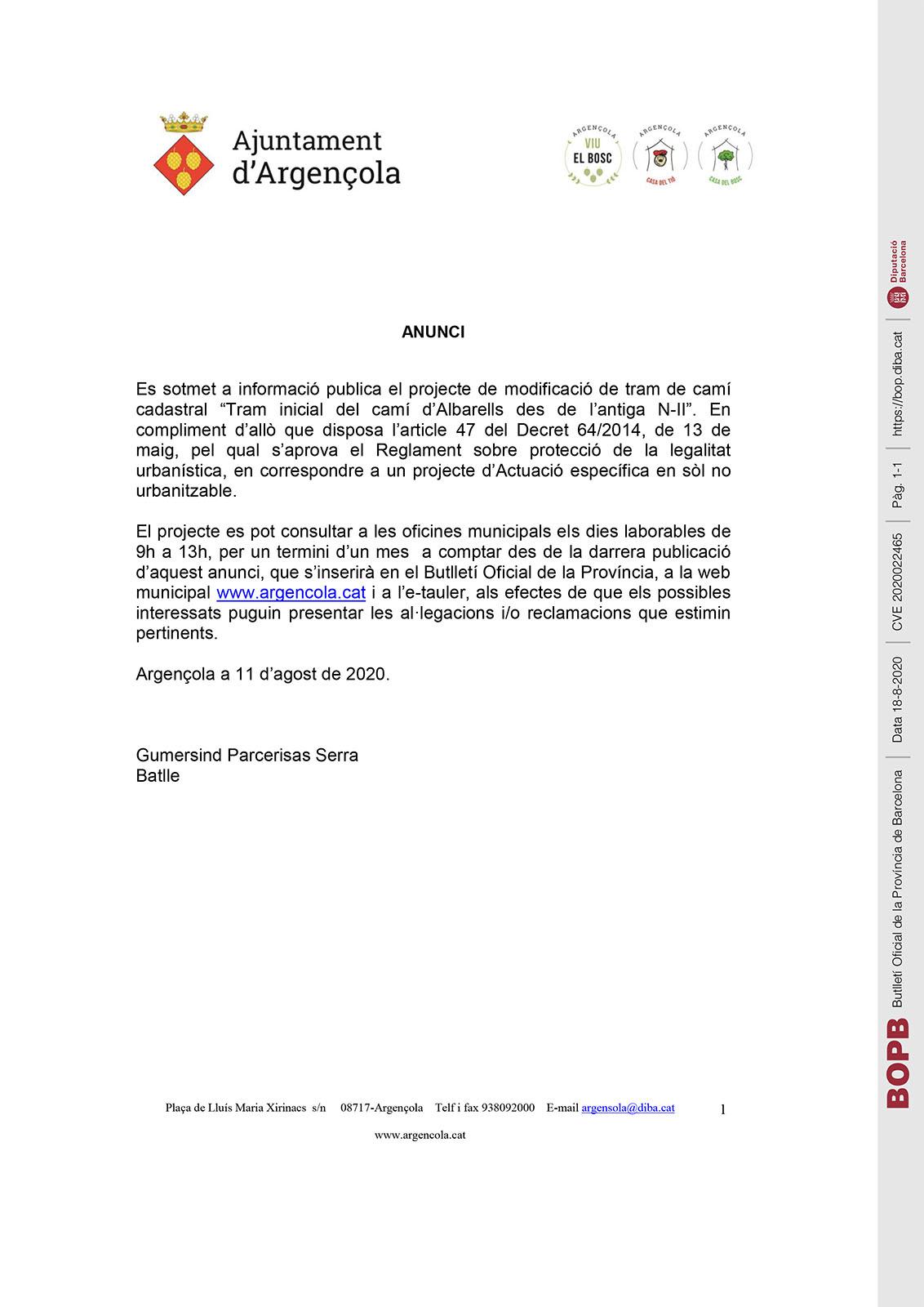 Es sotmet a informació publica el projecte de modificació de tram de camí cadastral “Tram inicial del camí d’Albarells des de l’antiga N-II”. En compliment d’allò que disposa l’article 47 del Decret 64/2014, de 13 de maig, pel qual s’aprova el Reglament sobre protecció de la legalitat urbanística, en correspondre a un projecte d’Actuació específica en sòl no urbanitzable.