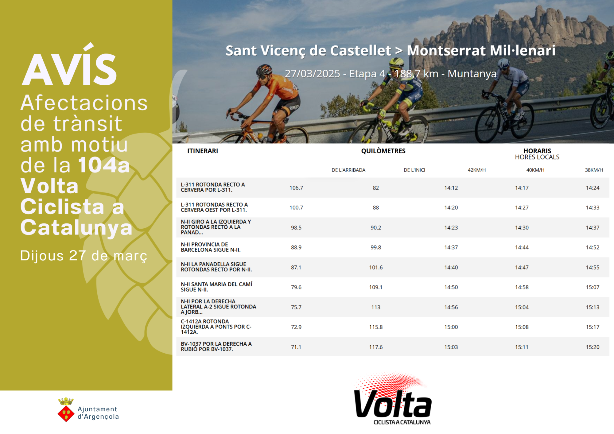 L'Ajuntament d'Argençola informa que el proper dijous, 27 de març de 2025, la 4a etapa de la 104a Volta Ciclista a Catalunya passarà per la comarca, concretament, prop d’Argençola, per La Panadella, Santa Maria del Camí i per les carreteres laterals a la NII.